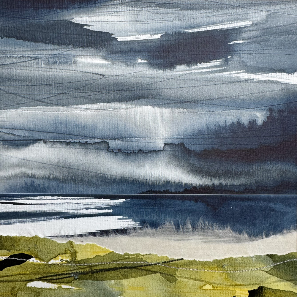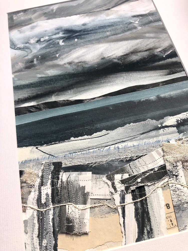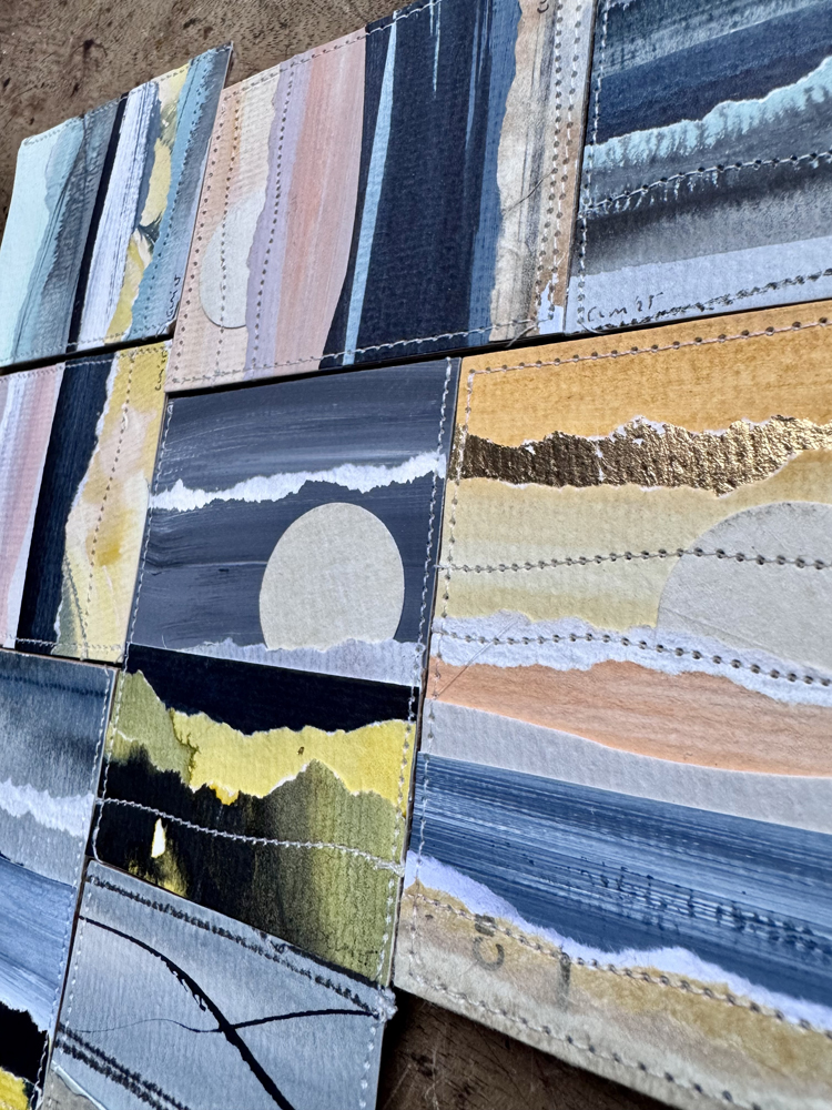 Inspired by the ever-changing landscapes of the Yorkshire countryside, Claire Louise Mather’s sewn paper works explore themes of memory and place. Using dyed and found papers, she tears, combines and stitches them together, forming abstract, layered landscapes.
