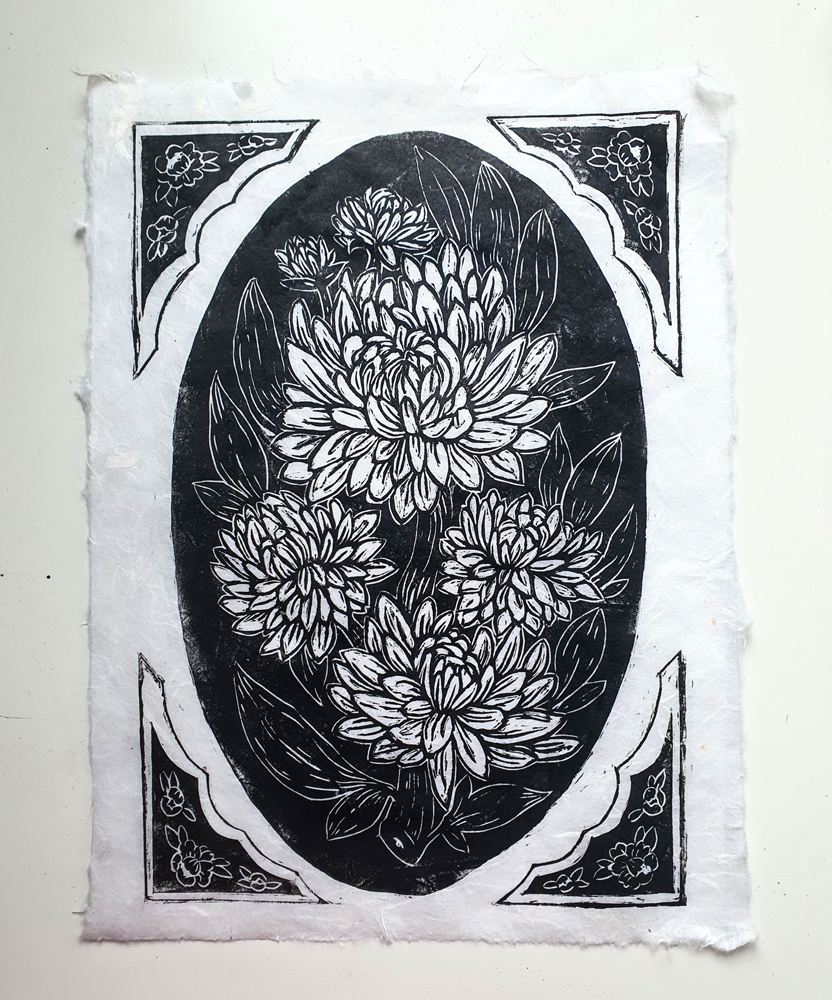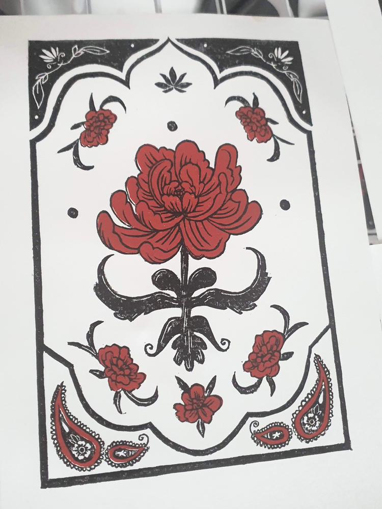 Fizah creates linocut prints that are inspired by floral and botanical art. She is a recent graduate and emerging printmaker whose practice is rooted in a deep appreciation for nature, botany, and biological forms. Her work begins with observational sketching, drawing inspiration from organic structures such as plants, flowers, and natural growth patterns.
