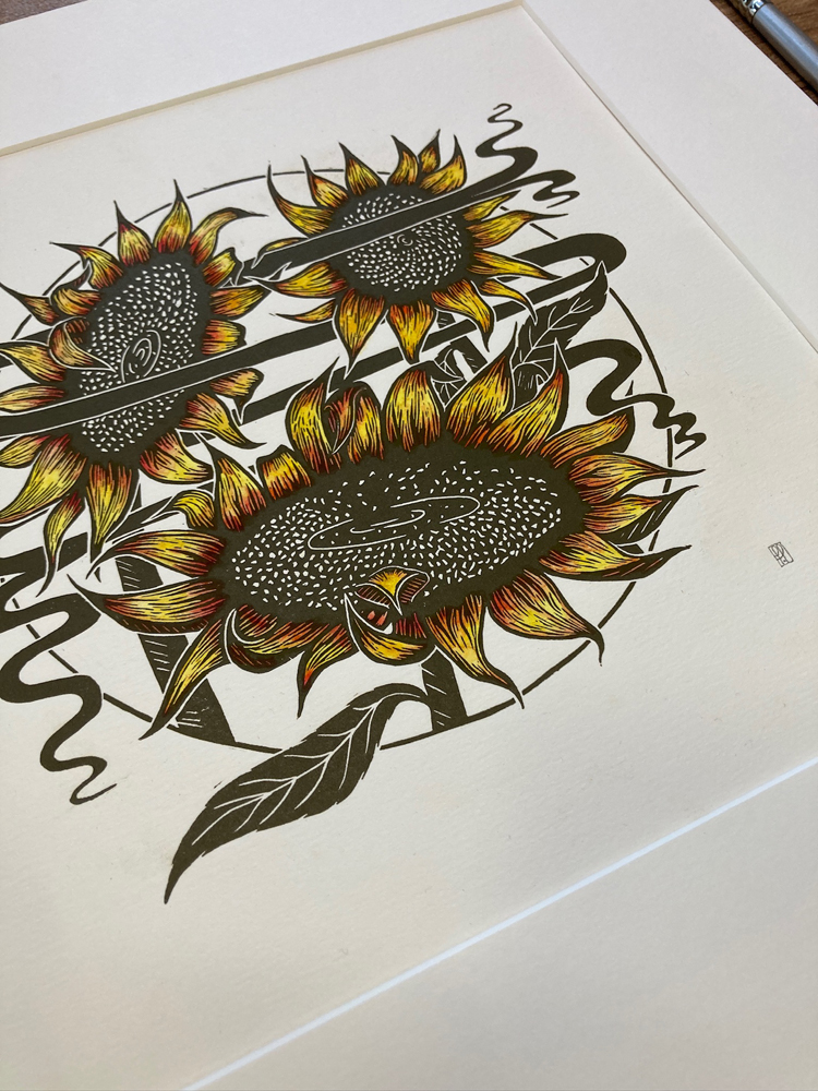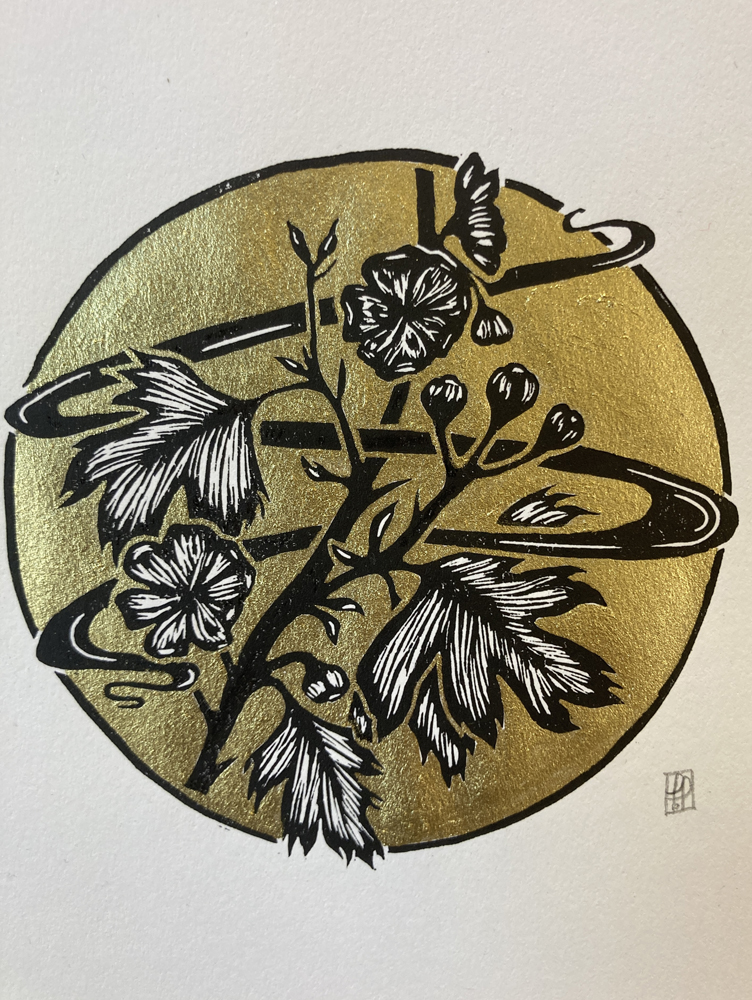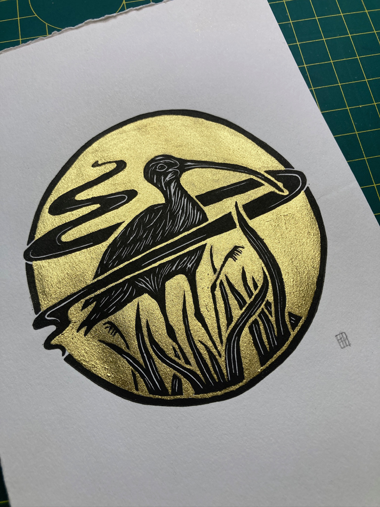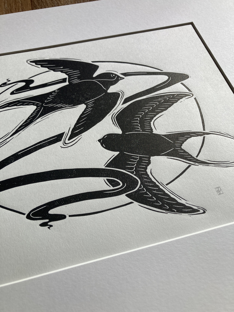Combining strong composition with a subtle Art Nouveau influence, she often incorporates gilded elements and delicate watercolour additions. Each piece begins as pages of sketches and “brain doodles” before being developed and hand printed in her studio, with a focus on craftsmanship and atmosphere.