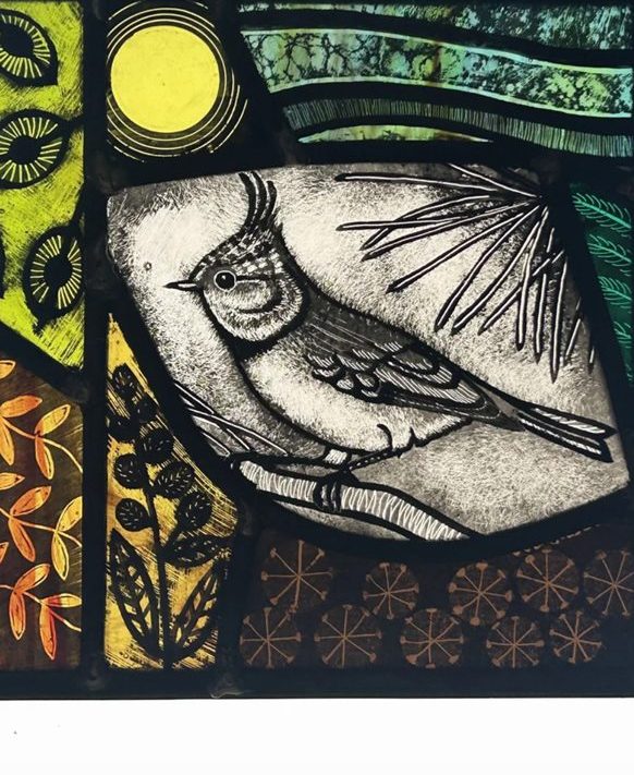 Inspired and taken from nature, Harriet creates unique hand painted stained glass pieces to hang in the home. She follows the tradition of leaded windows evoking the symbolism of British Wildlife and Nature in colourful collages and pattern in her illustrative graphic style.