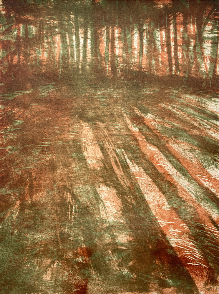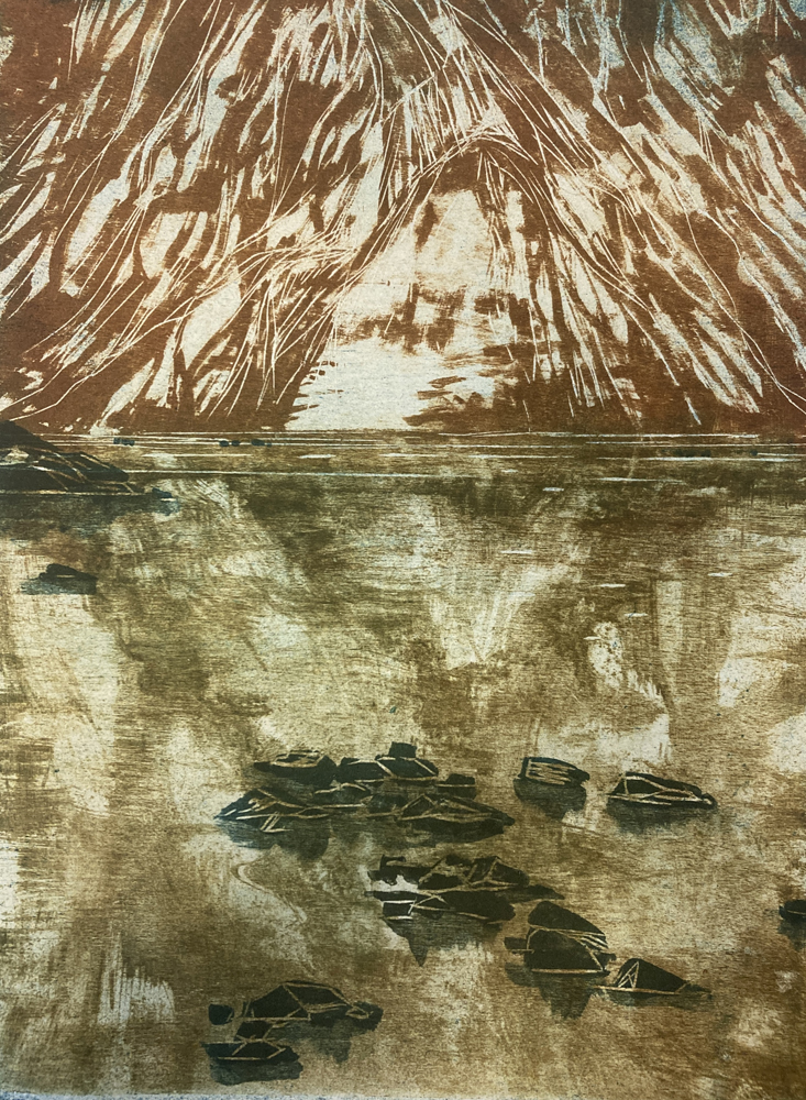 June creates original fine art prints exploring real and imagined places. Inspired by landscapes that linger in memory, her work reflects the relationship between people and their environment; what gives a place its emotional pull. Each piece evolves over time in the studio, often revisited and reworked to capture the feeling of being there.