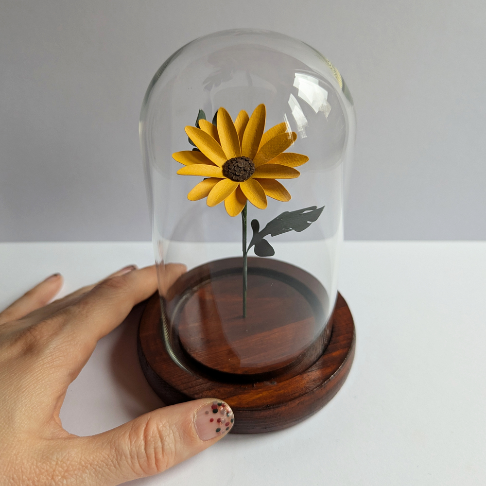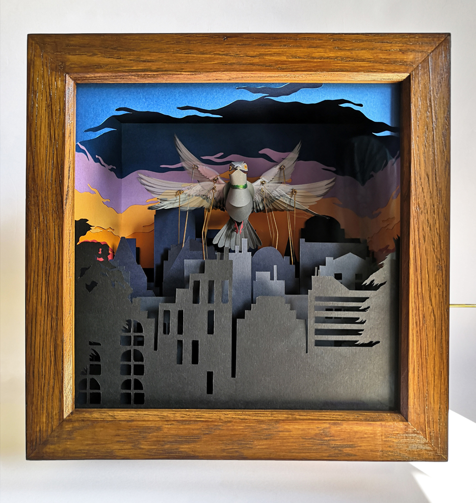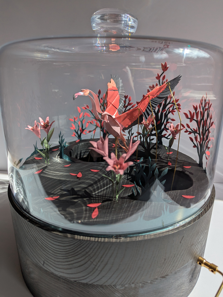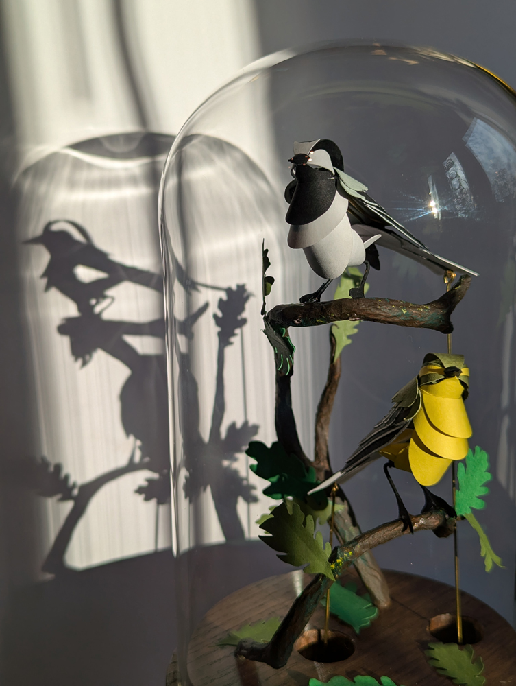Inspired by mythology and fact surrounding birds and the natural world, Lucy creates sculptures and delicate automata by hand cutting paper and hand-crafting brass mechanisms. Each sculpture is displayed inside a glass bell jar with a wooden base, or encased in a glass fronted, wooden box frame, with a hand stained finish. Lucy has spent over 10 years working on her craft, perfecting her mechanisms inspired by traditional automata and refining her paper sculpture designs creating a distinct style that plays with geometry and negative space.