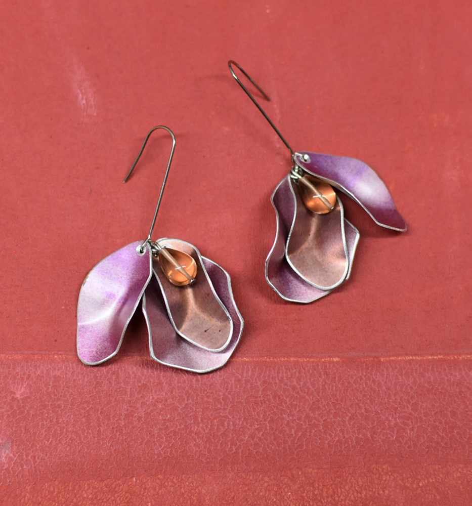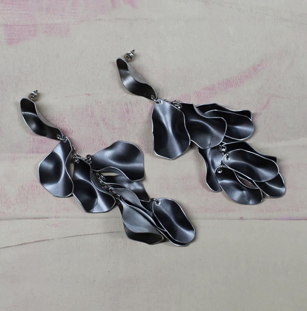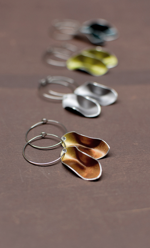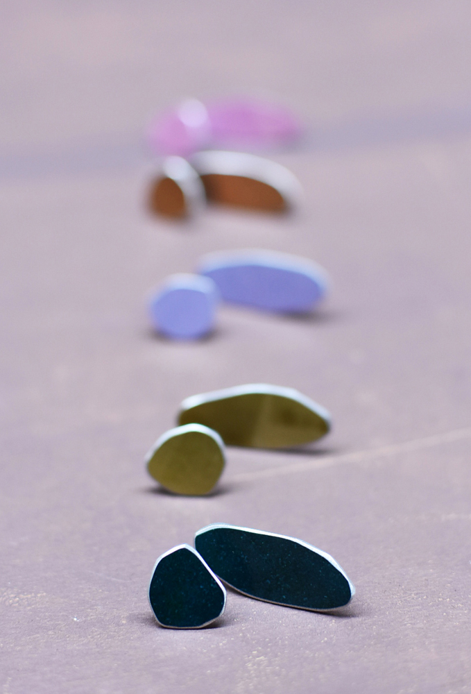 Sarah is a print making jewellery designer working with aluminium, based in Yorkshire. Originally from a textile print background, she has always loved experimenting with colour, layering and mark making. Sarah prints using disperse inks or pigments onto aluminium sheet by heat transfer. Pieces are hand cut, formed and finished. She enjoys mixing and matching digital imagery with textural ink effects and the process allows for some fun subject prints. The nature of this sublimation print process means each piece is totally unique and creating bespoke ranges is her favourite way to work. Known as the ‘green’ metaI, aluminium is feather light to wear and does not tarnish. Sarah make earrings, necklaces and rings, with prices ranging from £25 – £125